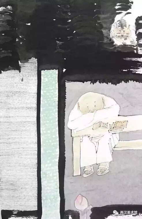 我们常常看到一些虽用心良苦、笔墨满纸,却一片浑沌、死灰无神的画面,实于不明用墨妙法之故也。但看洪啸之作,用墨并不太多,然干、湿、浓、淡俱备。当浓处则浓,当淡处则淡。有时一笔之间,浓浓淡淡,干干湿湿,灵活多变,别有情致。即便运用大片的墨色来处理背景,也是那样的通透与鲜活。