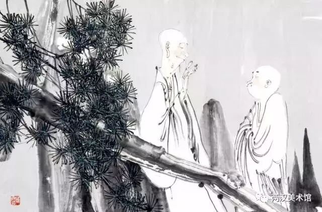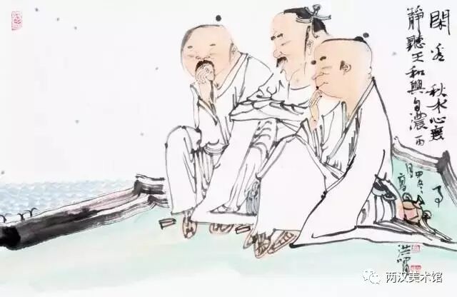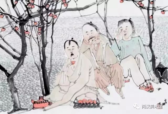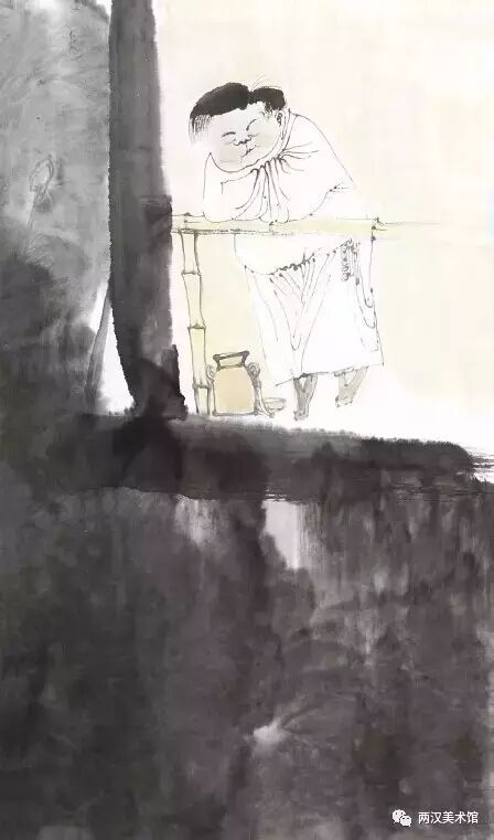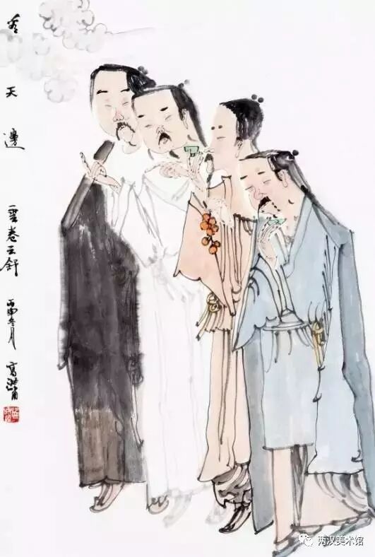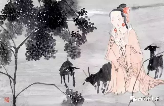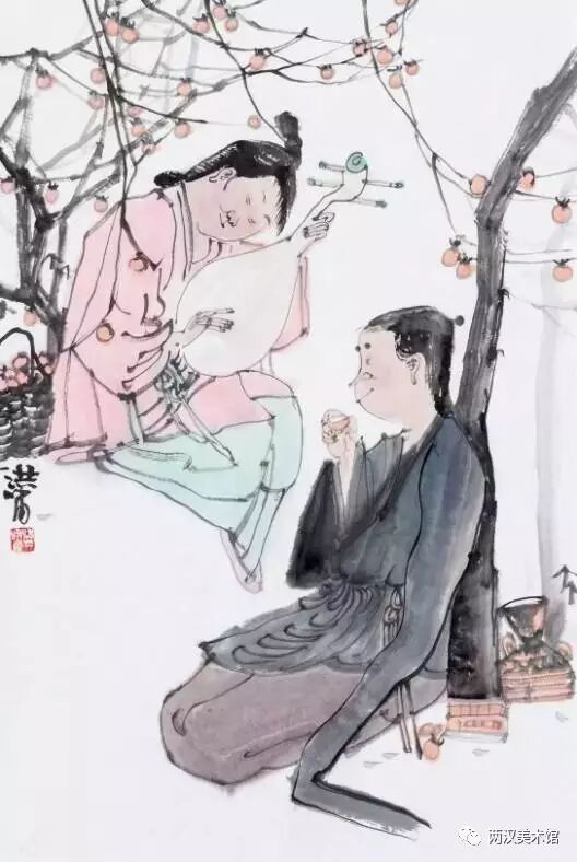 二是写实与装饰的统一。综观洪啸作品的人物造型及其他景物的刻画,基本上是属于写实的,并未做过多的夸张或变形。但他并不只是注重人体结构、面部表情与衣纹转折等那些细枝末节的变化,更不像当今一些画家采用西方“素描”的办法,去强调明暗、阴阳与立体的效果,而是采用极为简练的笔墨把形象概括出来。然而,不论是他的人物造型,还是配景景物的组合,间或是笔墨的运用,均都显示出一种协调而统一的“装饰味”。