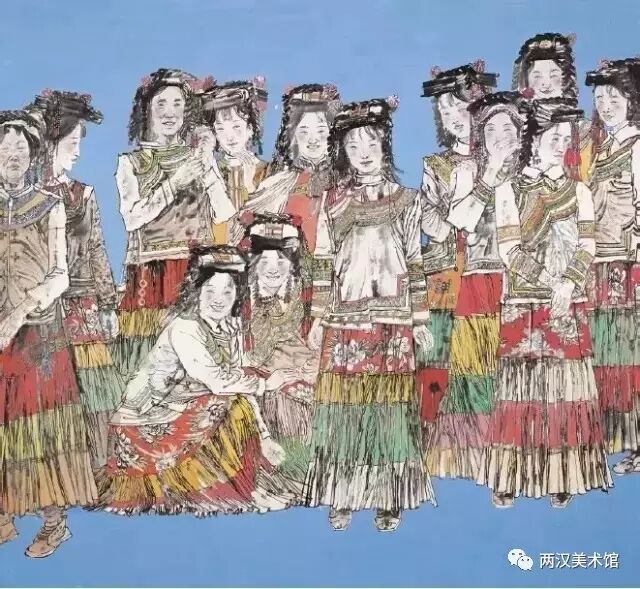 另在色彩的运用上也很有特色。乍看起来,在他的作品上用色很多,红红绿绿,无其不有,有时确是为了表现少数民族服装与饰品的需要。但他调配的色度大都很淡,故能让人感到虽多而不乱,虽艳而不俗。