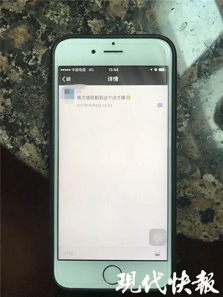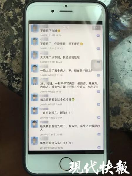 2017 年 10 月 6 日凌晨 3 点 43 分,朋友圈写道:" 每次值班,都到这个点才睡。" 到了白天 11 点 56 分,又发了一条朋友圈:"28 小时班,一刻不停写病历,做操作,开麻方,收病人,抽血气,睡了不到三个钟头,够够的!"