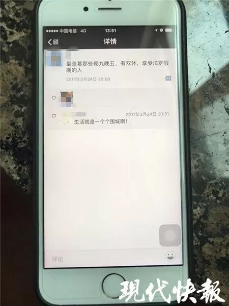 在朋友圈中,小顾还写道:" 最羡慕那些朝九晚五、有双休、享受法定假期的人。"